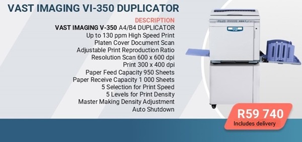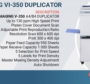 VI350 A3 Scan / B4 Print Duplicator – Thermal, Digital Display, Flatbed Scanner, First copy/ Master Production 19s, Scan resolution 300dpi X 600dpi. Print speed 55/70/85/105/130 ppm